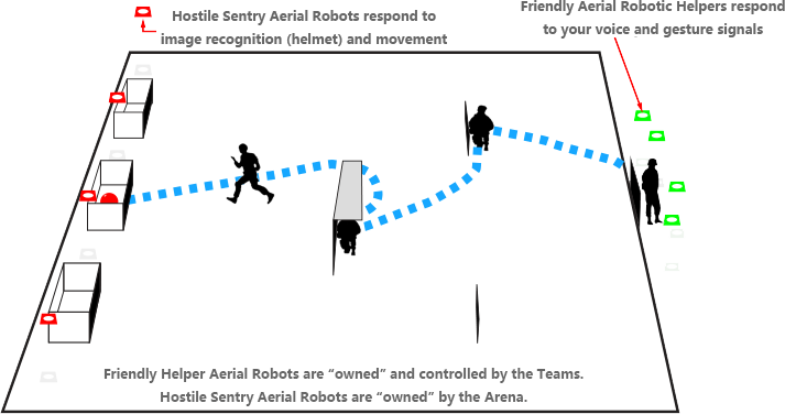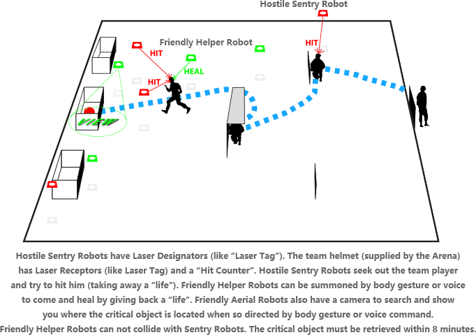 They should be able to provide a video stream to you using FPV-like display goggles or a WiFi mobile display device (receive only) that allows you to see what they see. For operational efficiency, it is desirable that they be able to communicate electronically amongst themselves. They must avoid collisions with sentry robots and can not land in the arena (if they land or if they collide with a Sentry robot, they will be disabled by a Judge). Your aerial robotic helpers can heal your laser hit wounds with a surgical laser (identical to the sentry robot laser, but coded differently), however only four such healings are possible. The presence of the surgical laser can also prevent sentry robot laser hits from being effective if within range and directed toward you at the same time you are shot by a sentry robot.Finally, it is desirable that your aerial robotic help-ers have an endurance of at least 8 minutes but their endurance is not mandated.